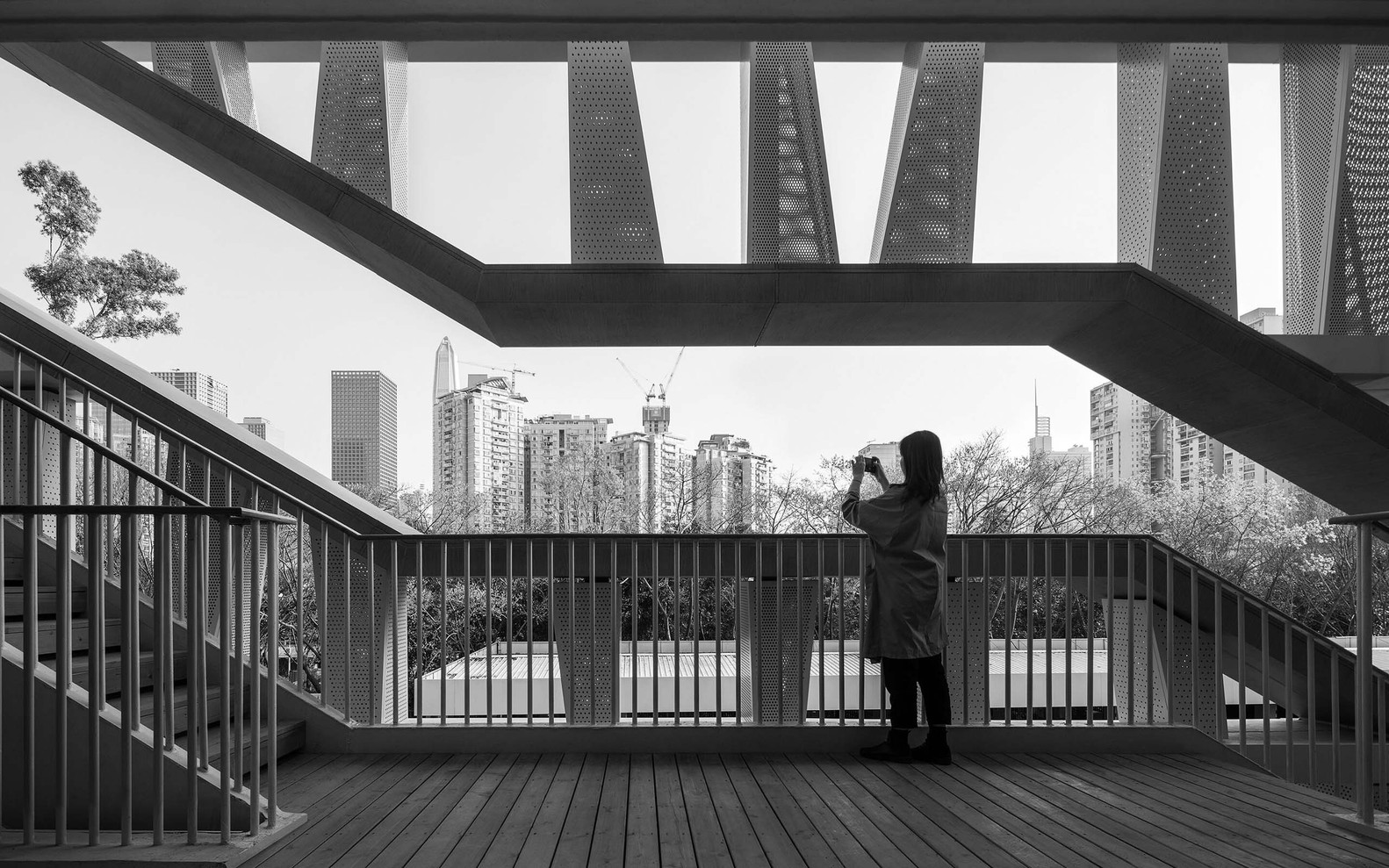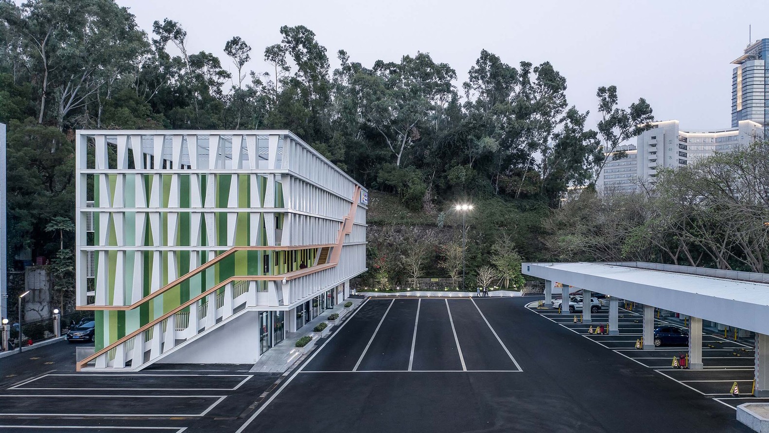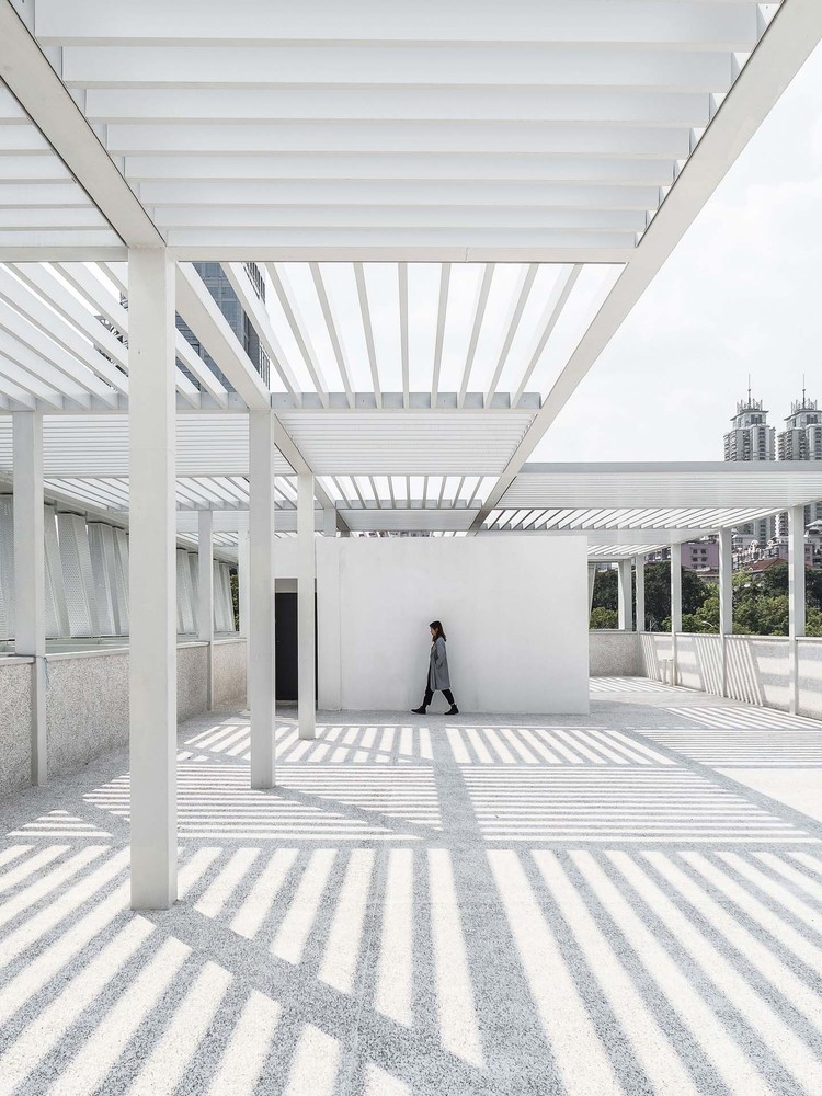 莲花山公交总站项目位于深圳福田区莲花山的西南角,新洲路与红荔路的交汇处。使用者是公交集团的三八红旗车队。改造前的建筑是三层高的瓷砖外墙的老房子,一层是办公,二层和三层是宿舍。陈旧的建筑设施与形象满足不了内部使用、对外交流和宣传的需求,于是公交集团决定通过整体建筑和环境的改造,以及把二层和三层的宿舍转化为党群中心和办公,为车队提供一个舒适的办公场所,也为市民提供优美的候车环境和优质的服务。